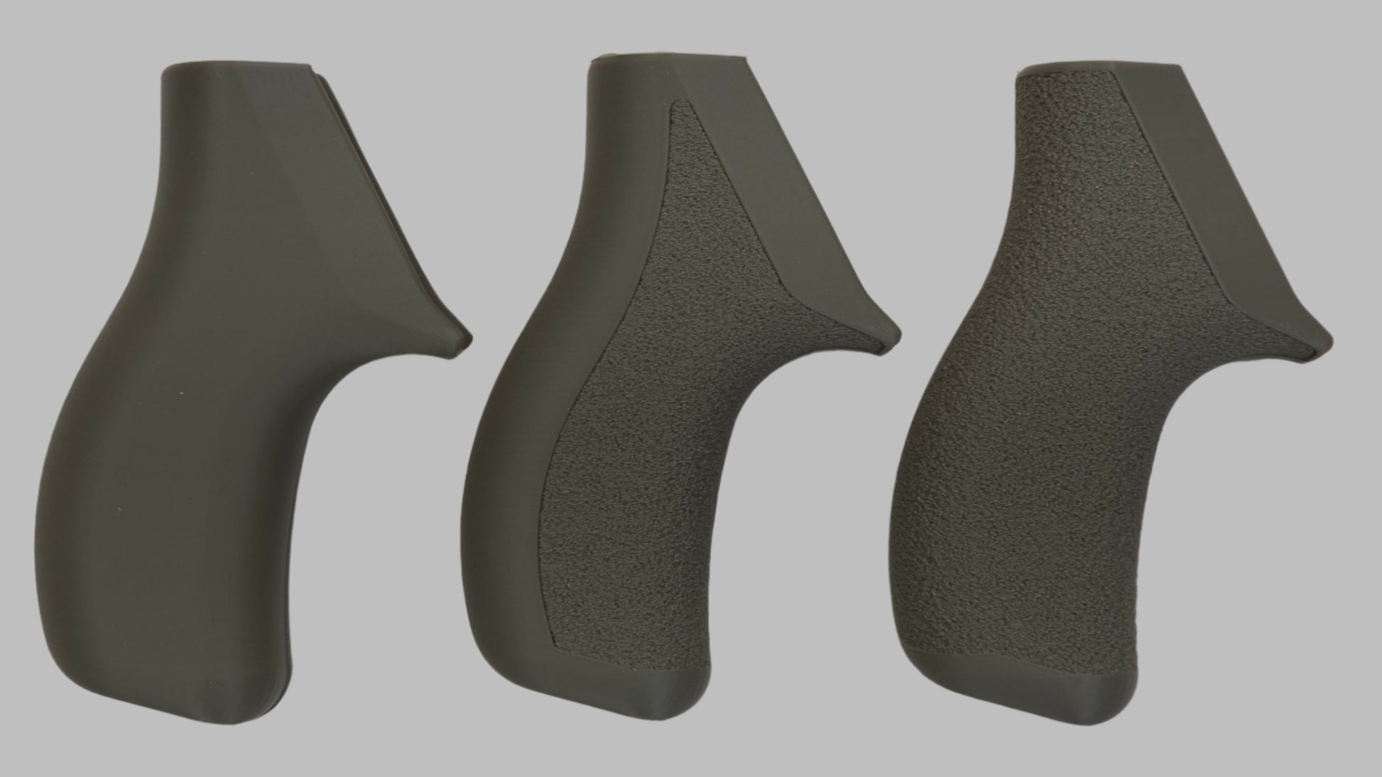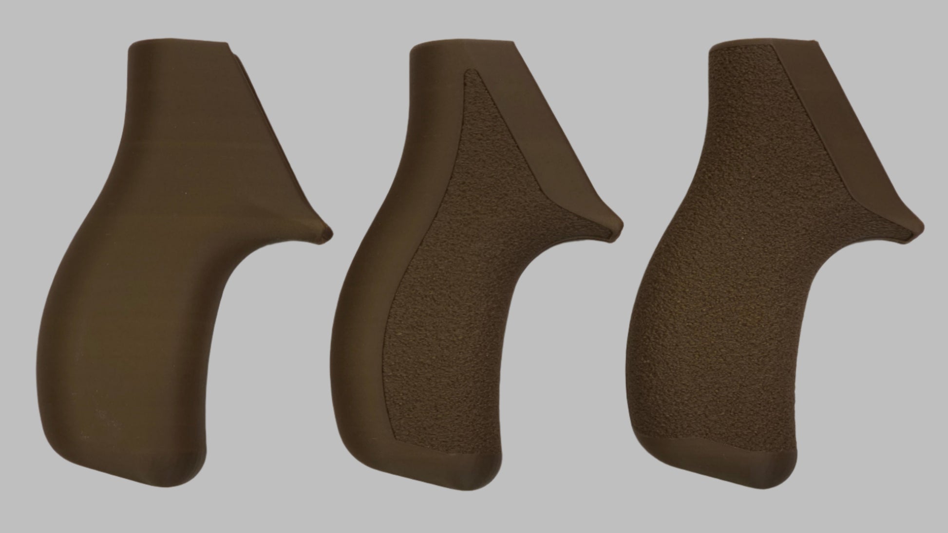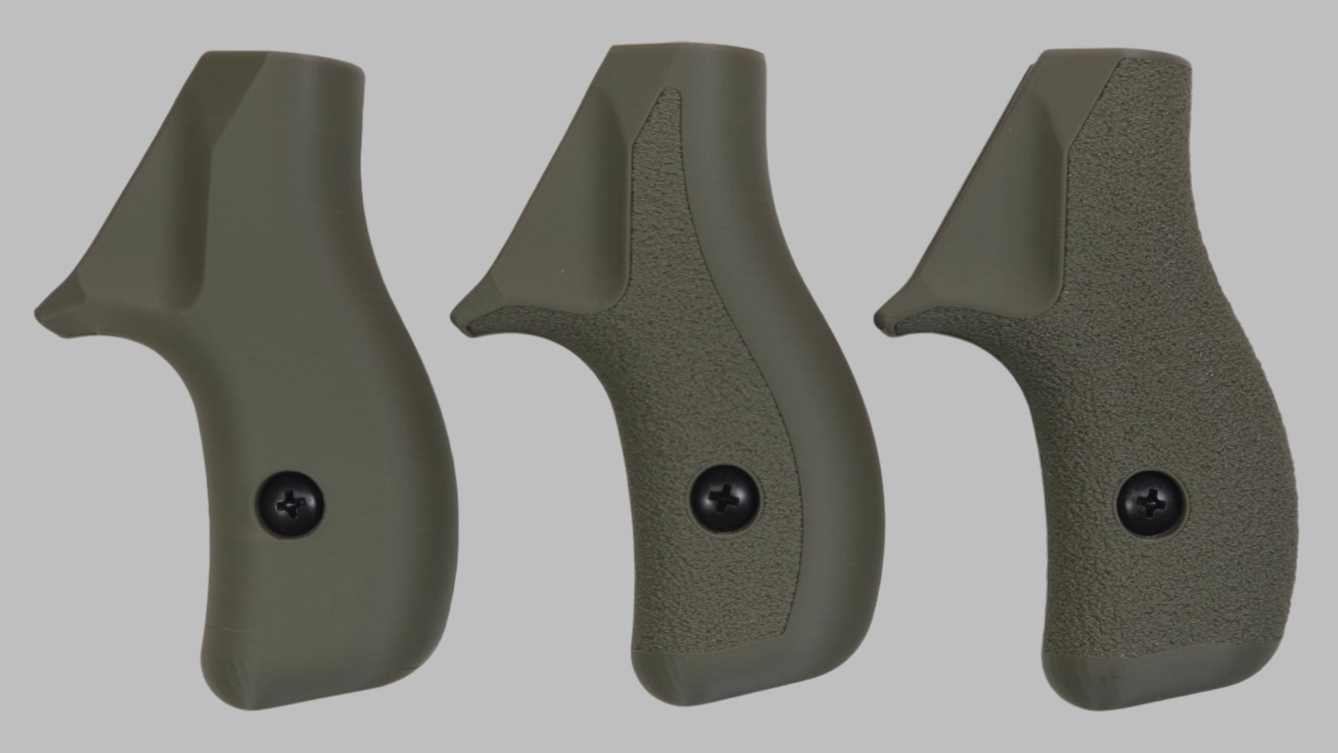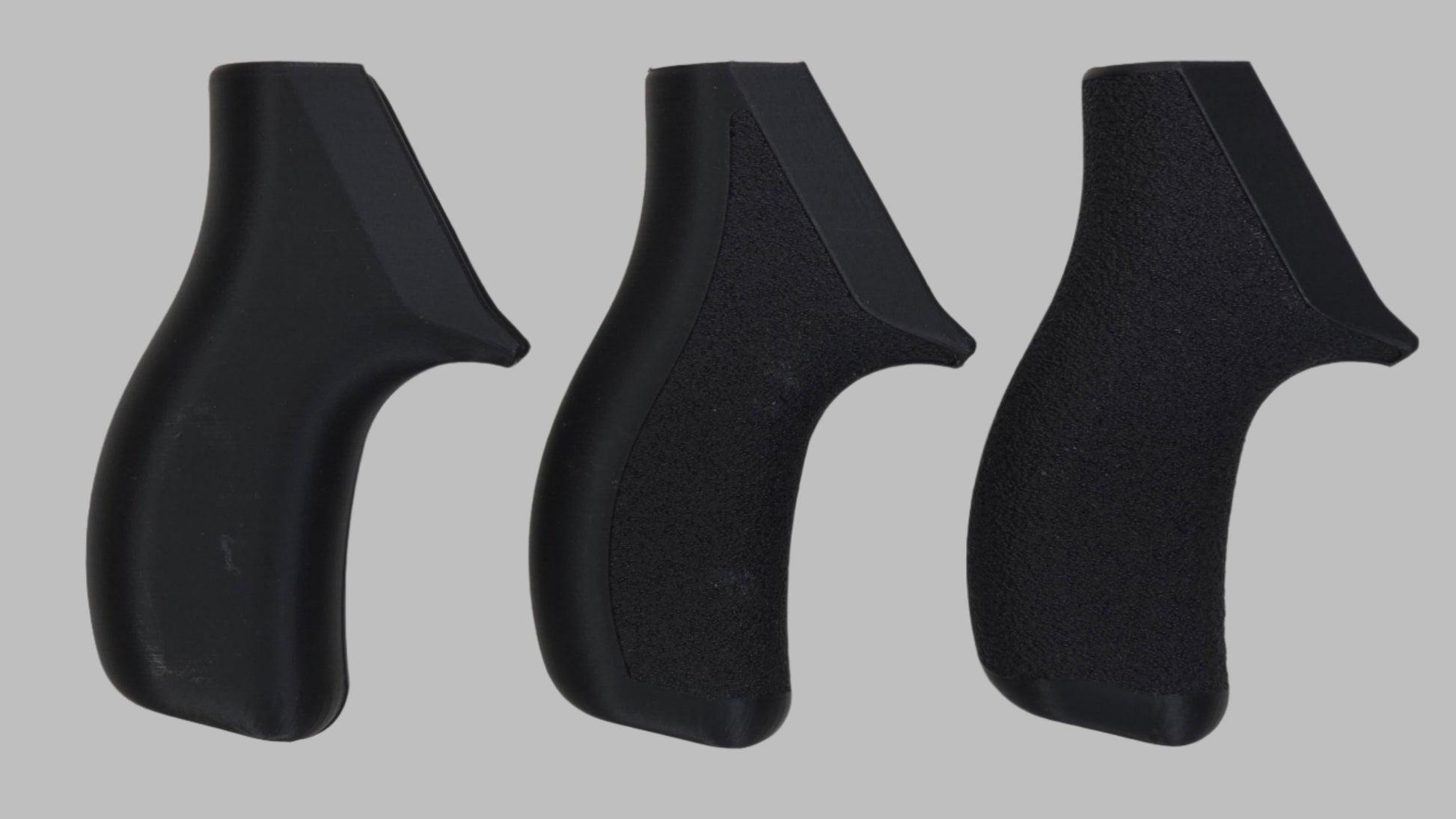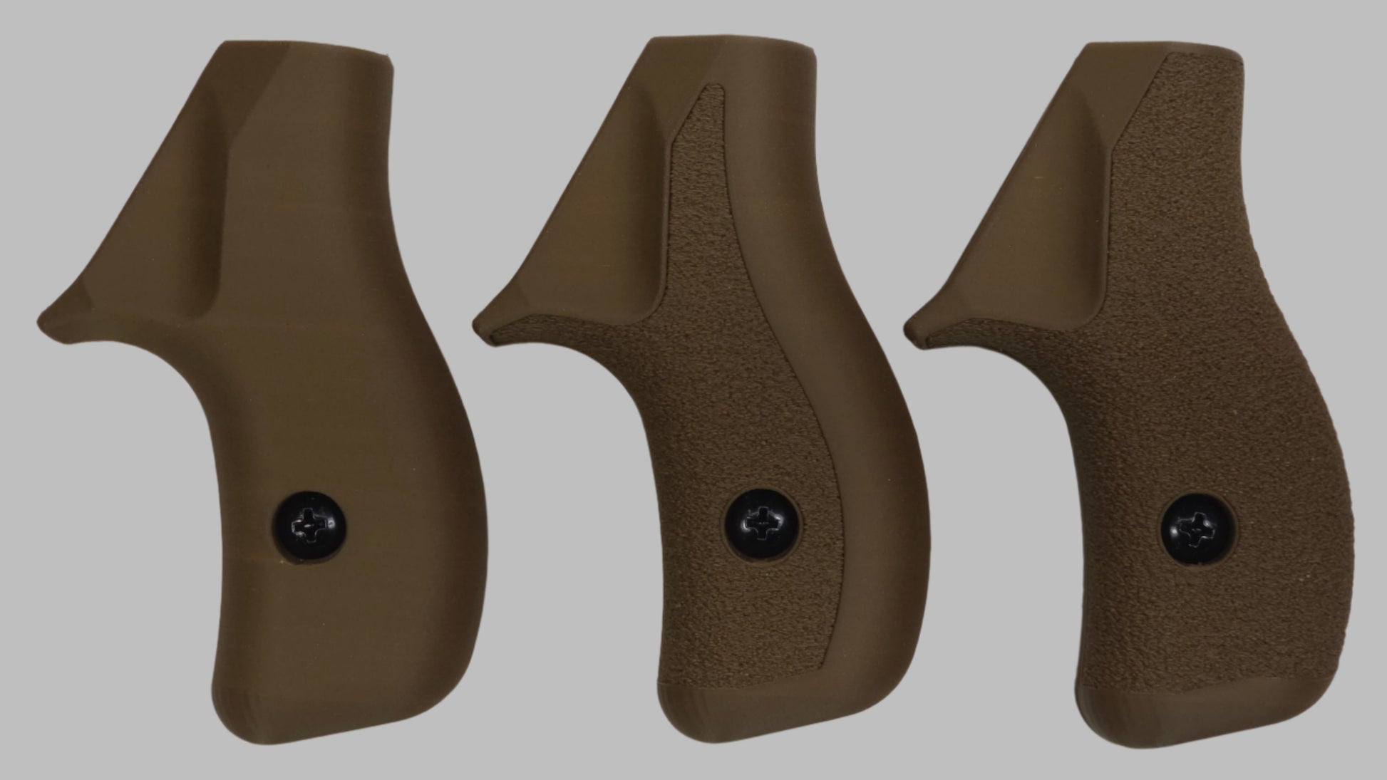 C² Polymer grips are 3D printed from durable PLA+ and have been extensively tested for several years. We offer a variety of attractive colors and three textures. Because of the printing process, the "Smooth" grips have layer lines that give a bit of purchase, but will not irritate skin or catch on clothing. The "Front Strap Stipple" texture give you a 60 grit sandpaper type texture where it counts on the front strap, but is still smooth on the back strap for carry comfort. The "Full Stipple" wraps that texture around the whole grip for maximum control.