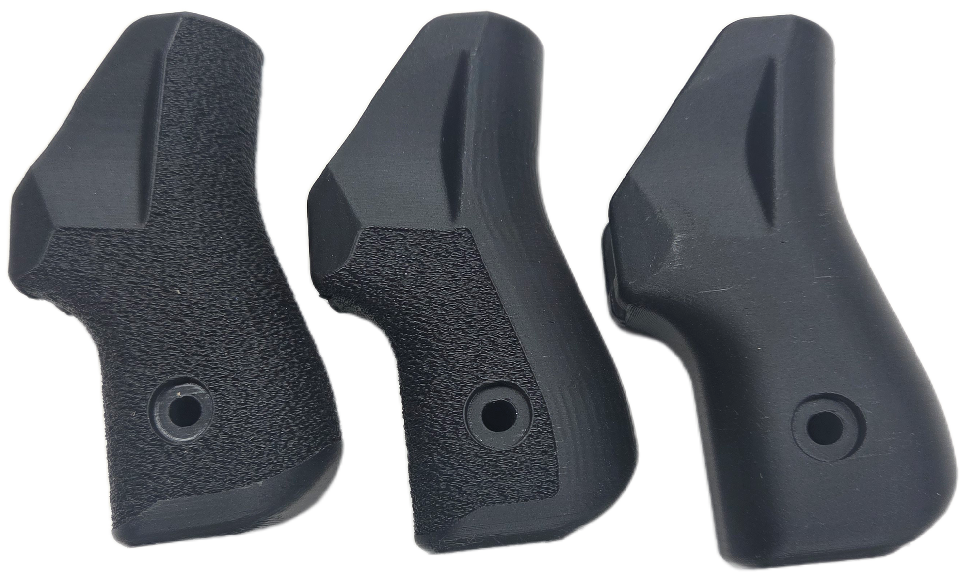 C² Polymer grips are 3D printed from durable PLA+ and have been extensively tested for several years. We offer a variety of attractive colors and three textures. Because of the printing process, the "Smooth" grips have layer lines that give a bit of purchase, but will not irritate skin or catch on clothing. The "Front Strap Stipple" texture give you a 60 grit sandpaper type texture where it counts on the front strap, but is still smooth on the back strap for carry comfort. The "Full Stipple" wraps that texture around the whole grip for maximum control.