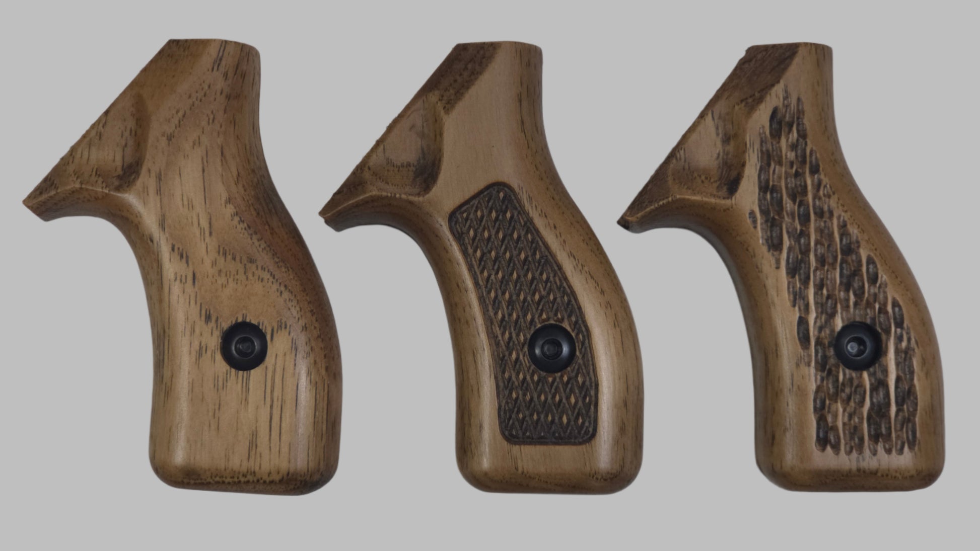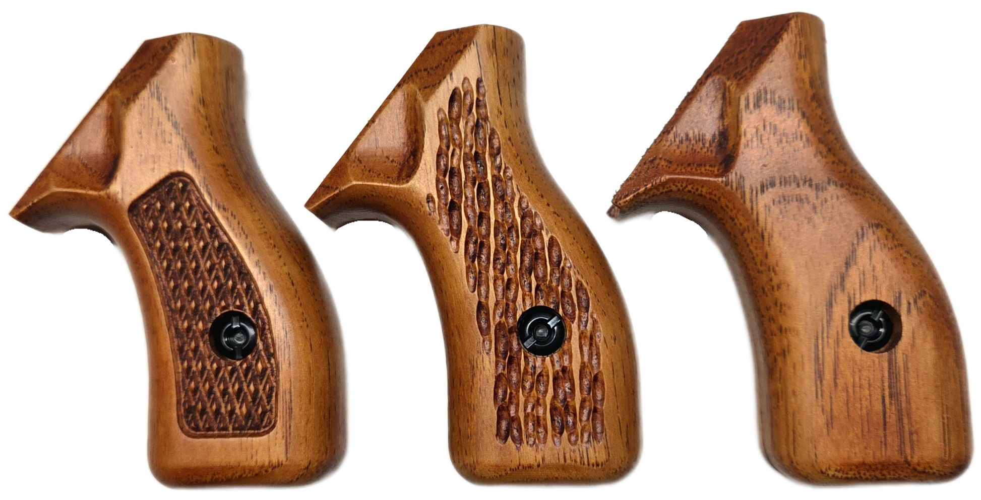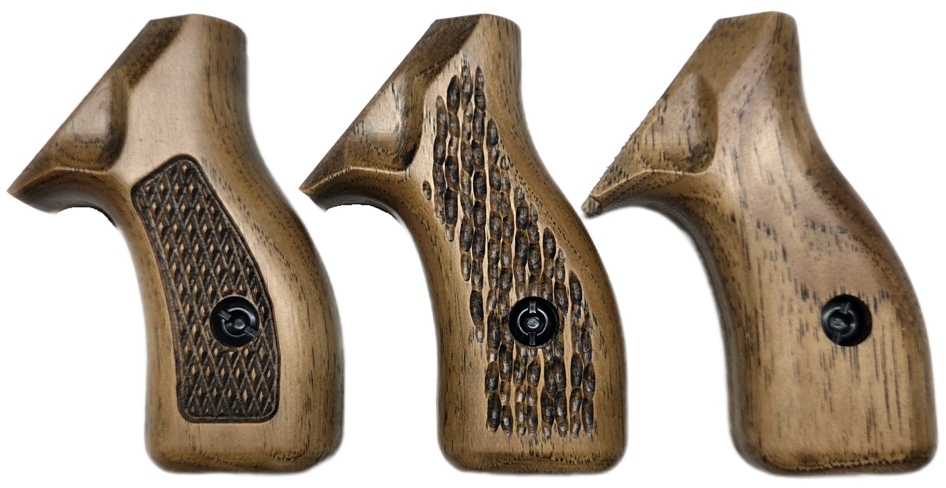 C² hardwood grips are CNC carved from U.S. grown hickory and then hand sanded, stained and finished with a satin polyurethane. We offer a variety of attractive stains and three textures. Please note, this is real wood and your grips will not exactly match the examples shown.