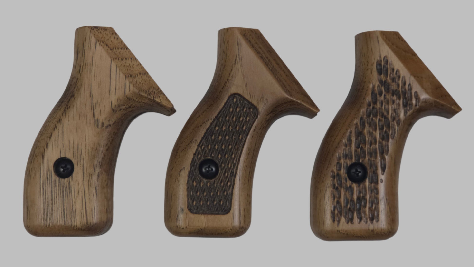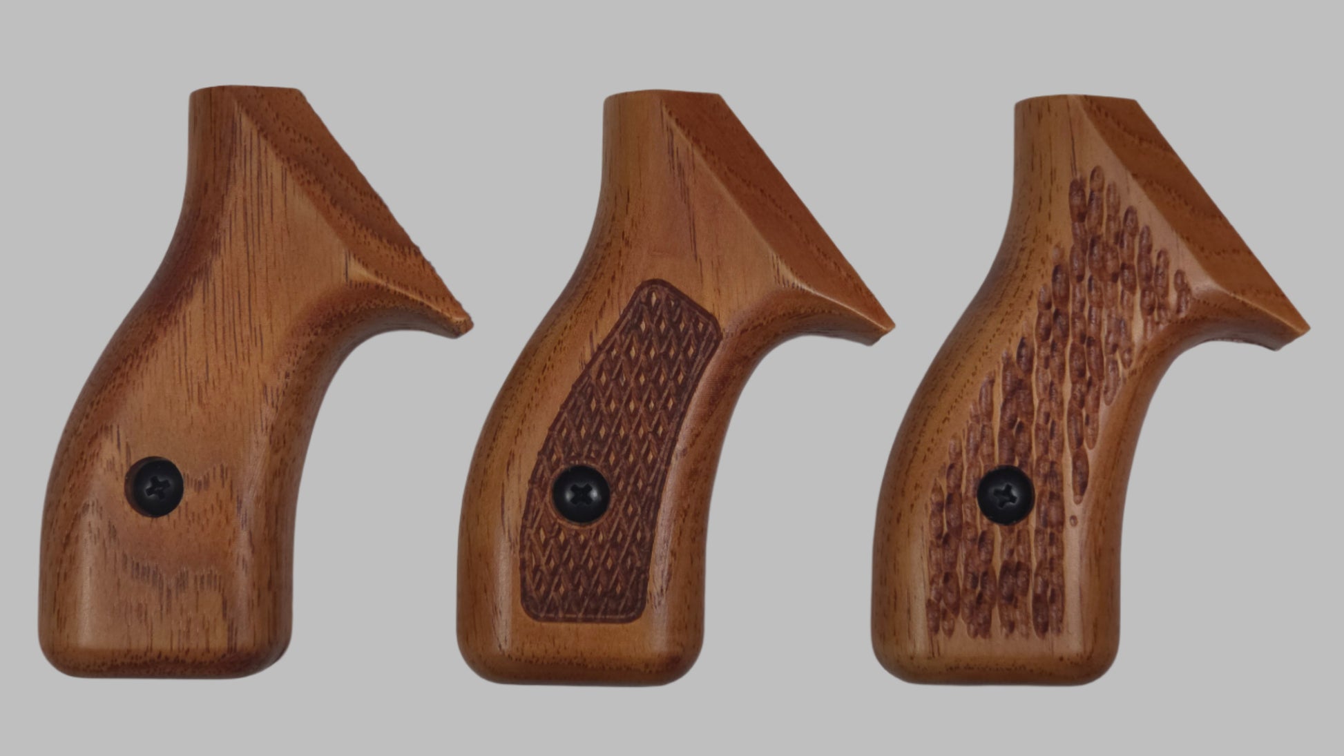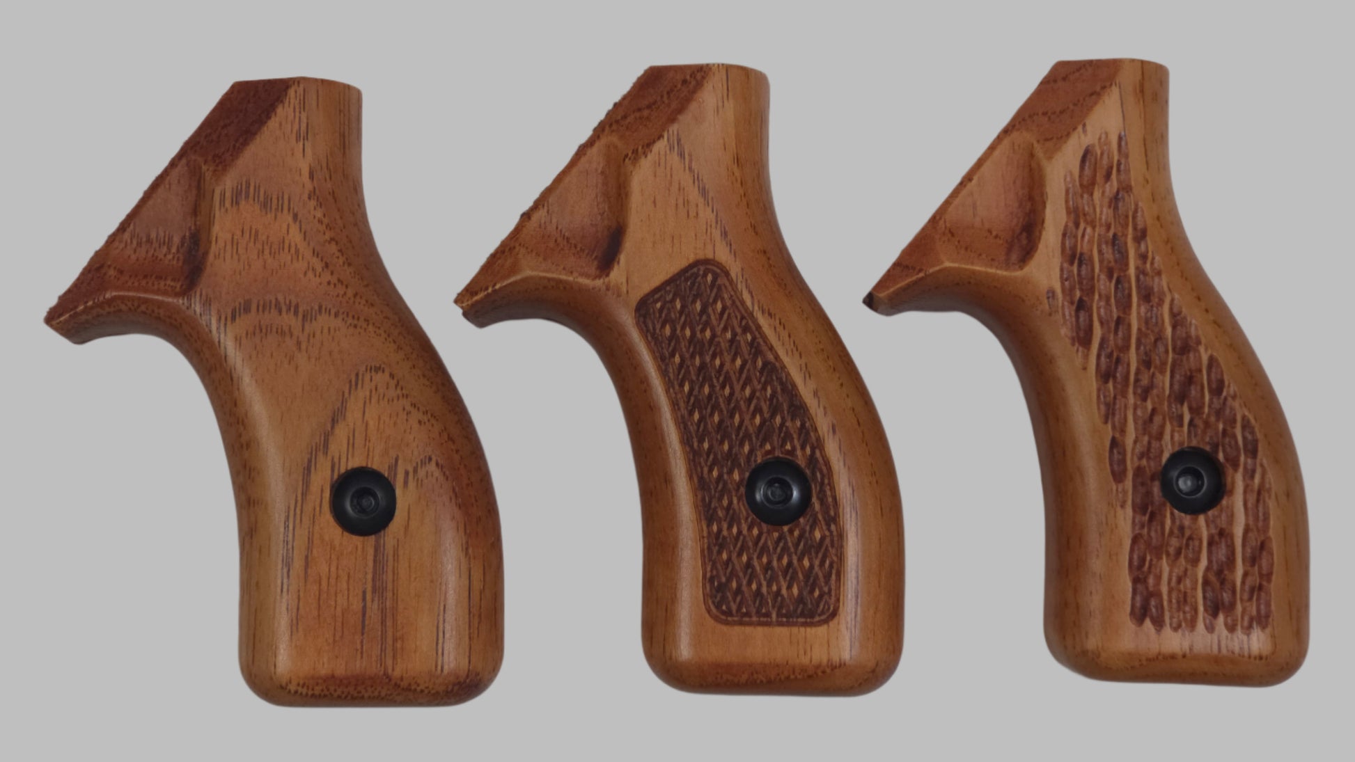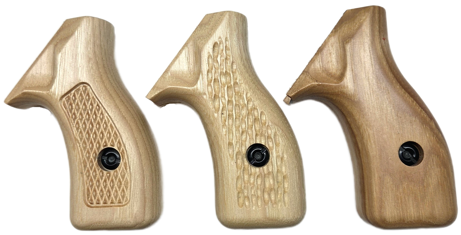 C² hardwood grips are CNC carved from U.S. grown hickory and then hand sanded, stained and finished with a satin polyurethane. We offer a variety of attractive stains and three textures. Please note, this is real wood and your grips will not exactly match the examples shown.