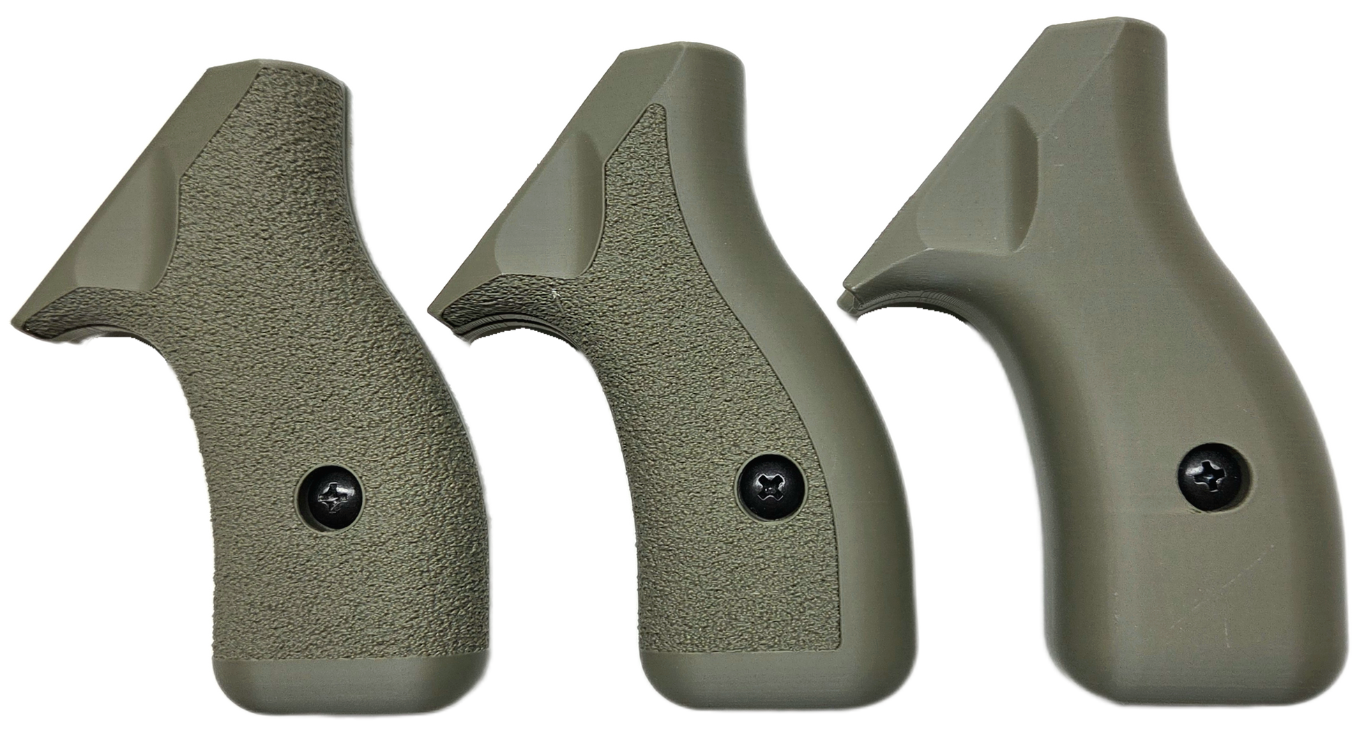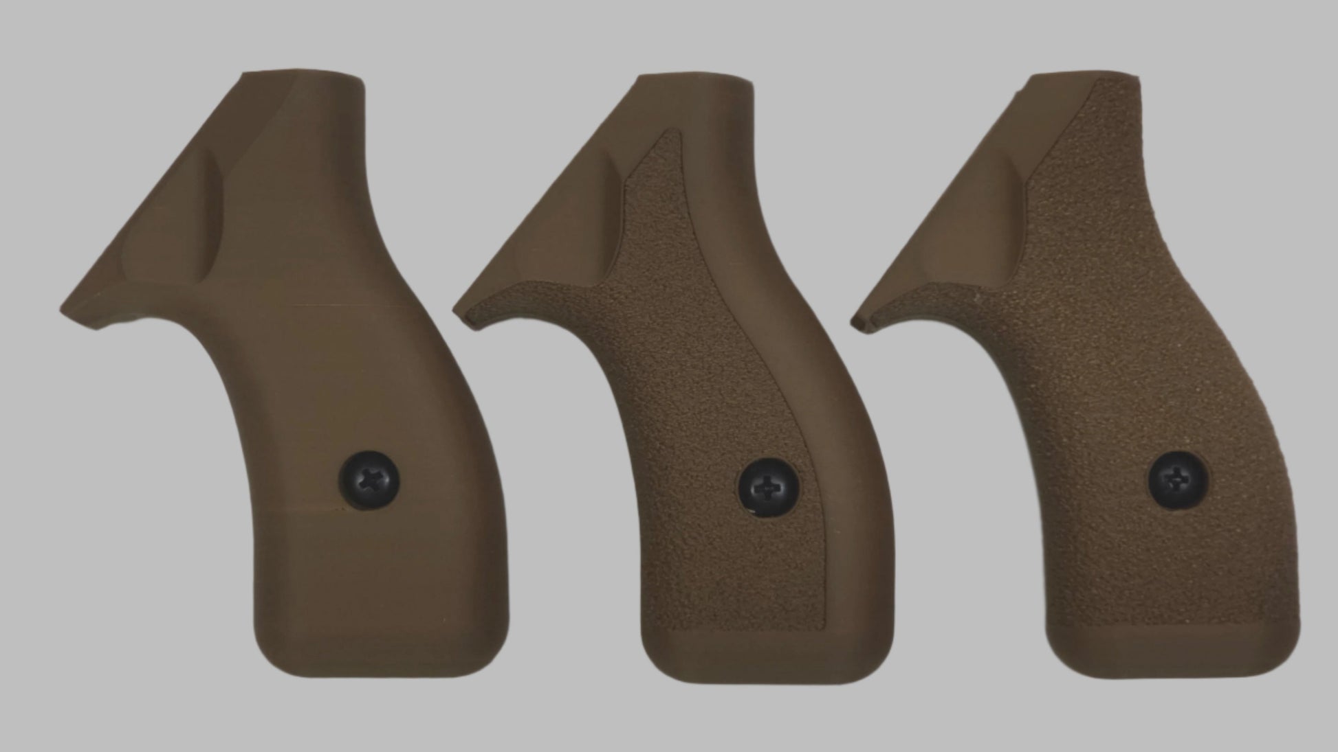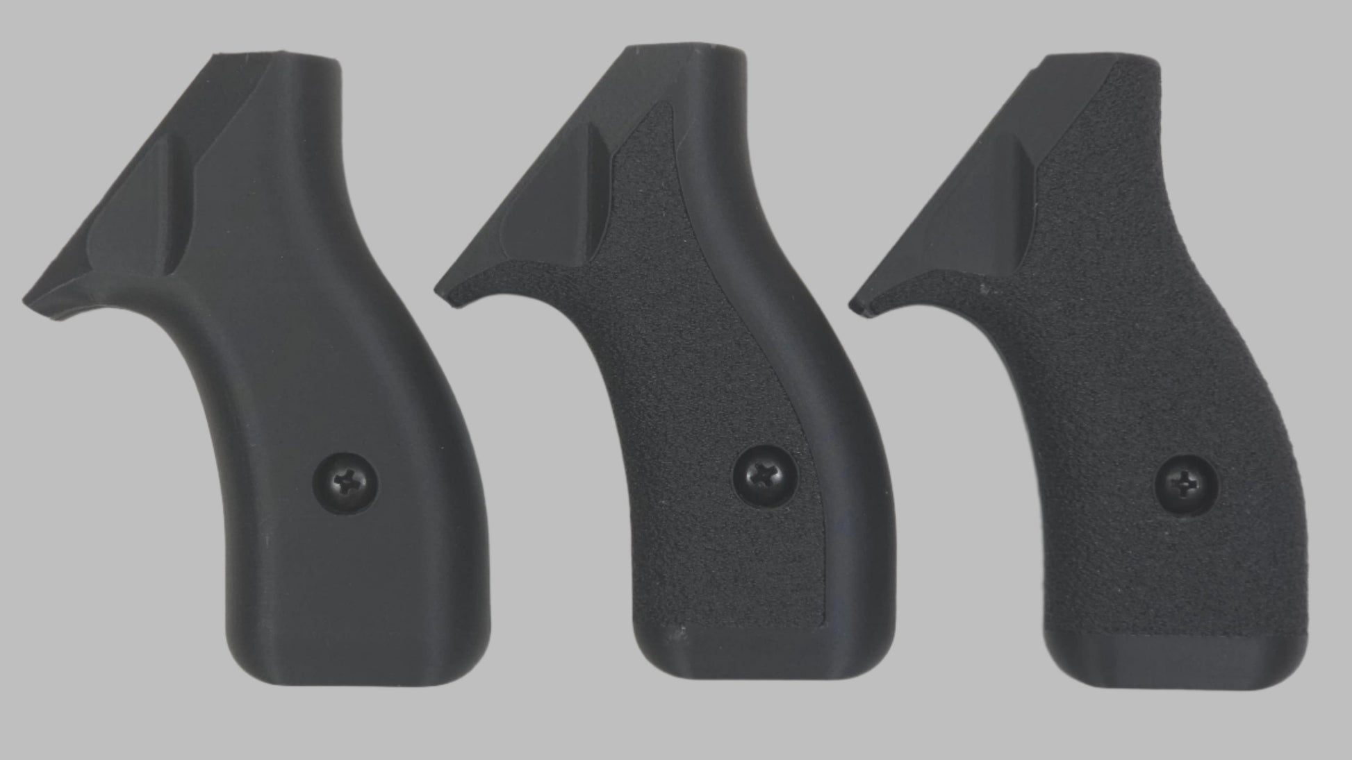 C² Polymer grips are 3D printed from durable PLA+ and have been extensively tested for several years. We offer a variety of attractive colors and three textures. Because of the printing process, the "Smooth" grips have layer lines that give a bit of purchase, but will not irritate skin or catch on clothing. The "Front Strap Stipple" texture give you a 60 grit sandpaper type texture where it counts on the front strap, but is still smooth on the back strap for carry comfort. The "Full Stipple" wraps that texture around the whole grip for maximum control.