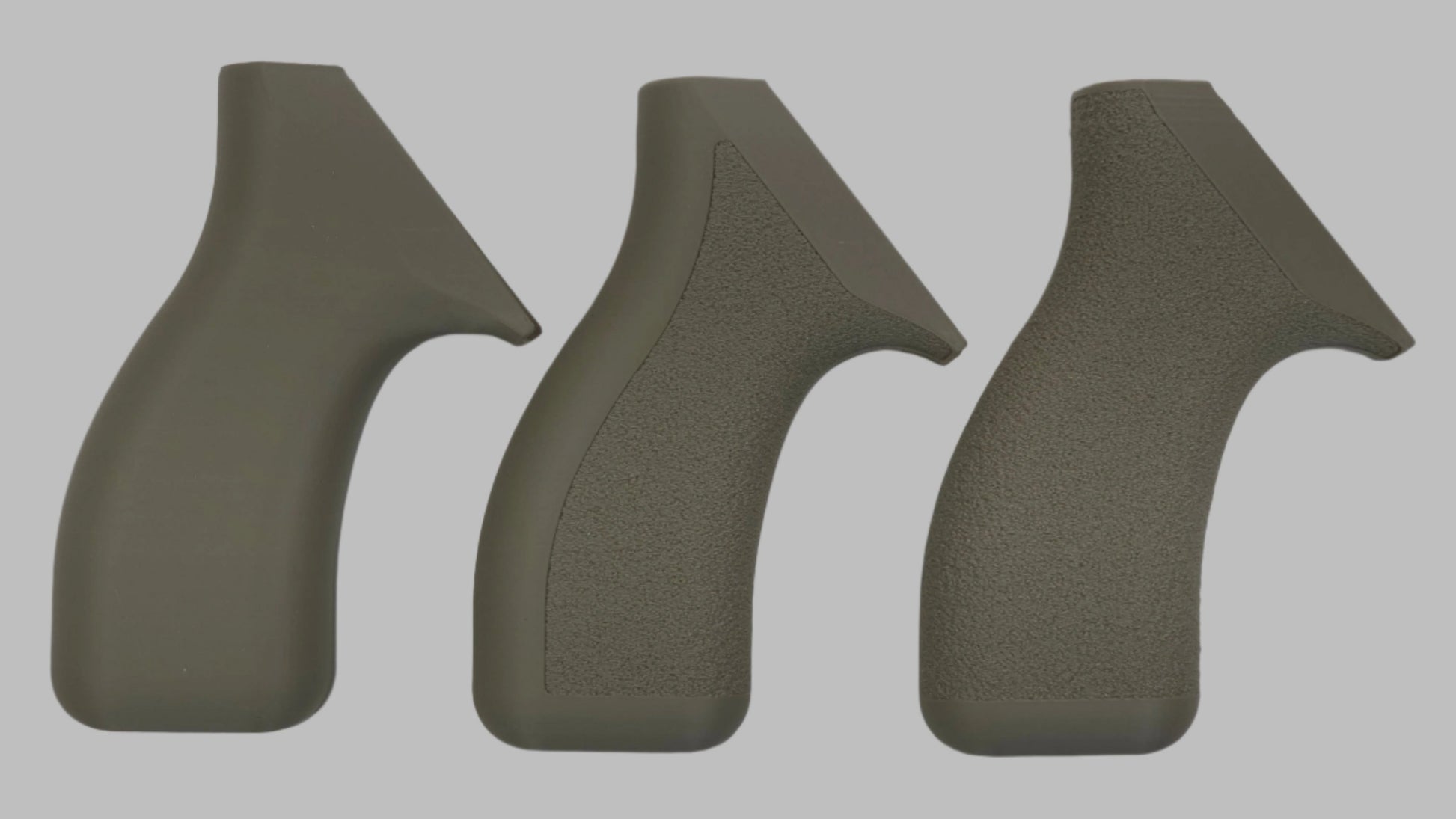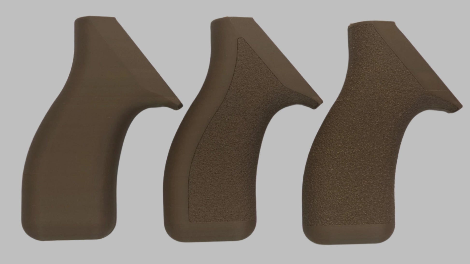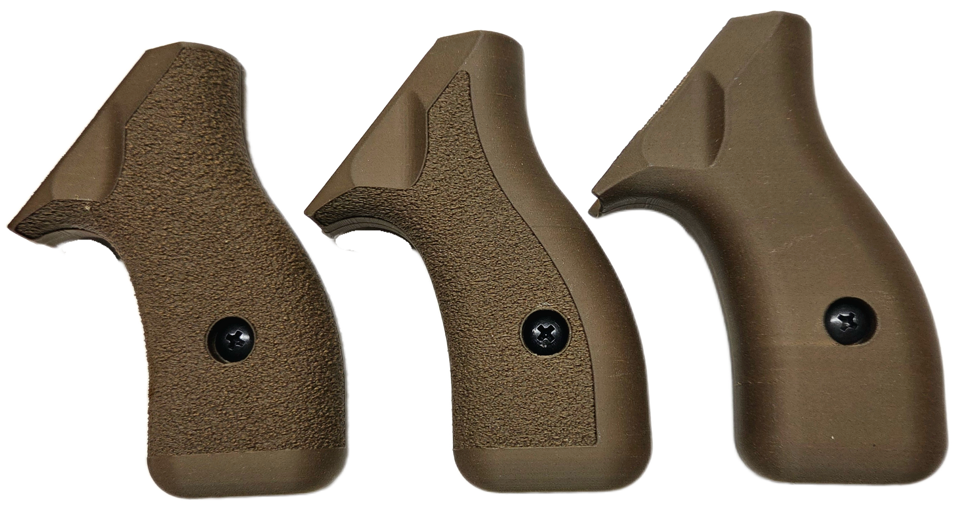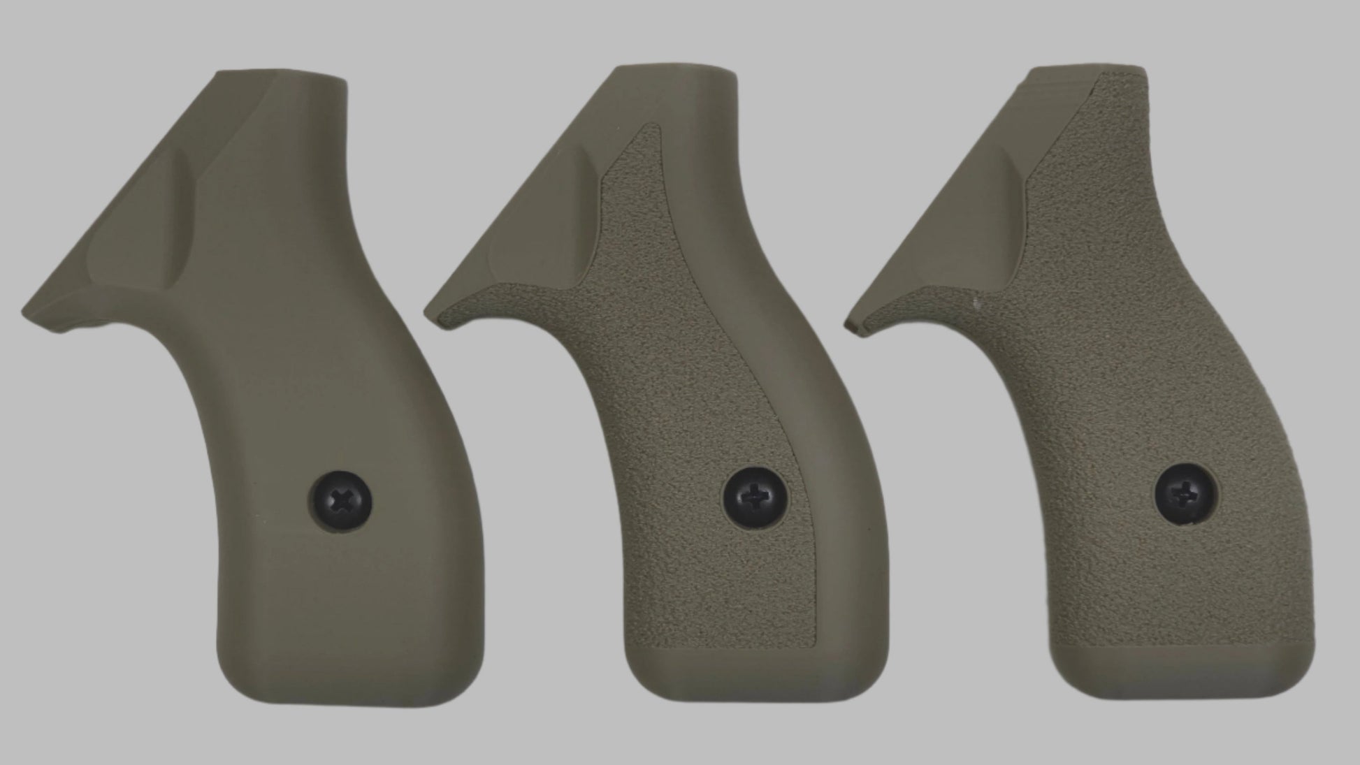 C² Polymer grips are 3D printed from durable PLA+ and have been extensively tested for several years. We offer a variety of attractive colors and three textures. Because of the printing process, the "Smooth" grips have layer lines that give a bit of purchase, but will not irritate skin or catch on clothing. The "Front Strap Stipple" texture give you a 60 grit sandpaper type texture where it counts on the front strap, but is still smooth on the back strap for carry comfort. The "Full Stipple" wraps that texture around the whole grip for maximum control.