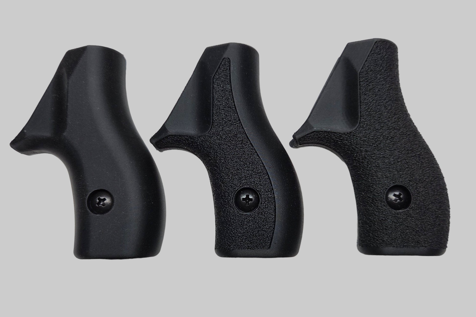 C² Polymer grips are 3D printed from durable PLA+ and have been extensively tested for several years. We offer a variety of attractive colors and three textures. Because of the printing process, the "Smooth" grips have layer lines that give a bit of purchase, but will not irritate skin or catch on clothing. The "Front Strap Stipple" texture give you a 60 grit sandpaper type texture where it counts on the front strap, but is still smooth on the back strap for carry comfort. The "Full Stipple" wraps that texture around the whole grip for maximum control.