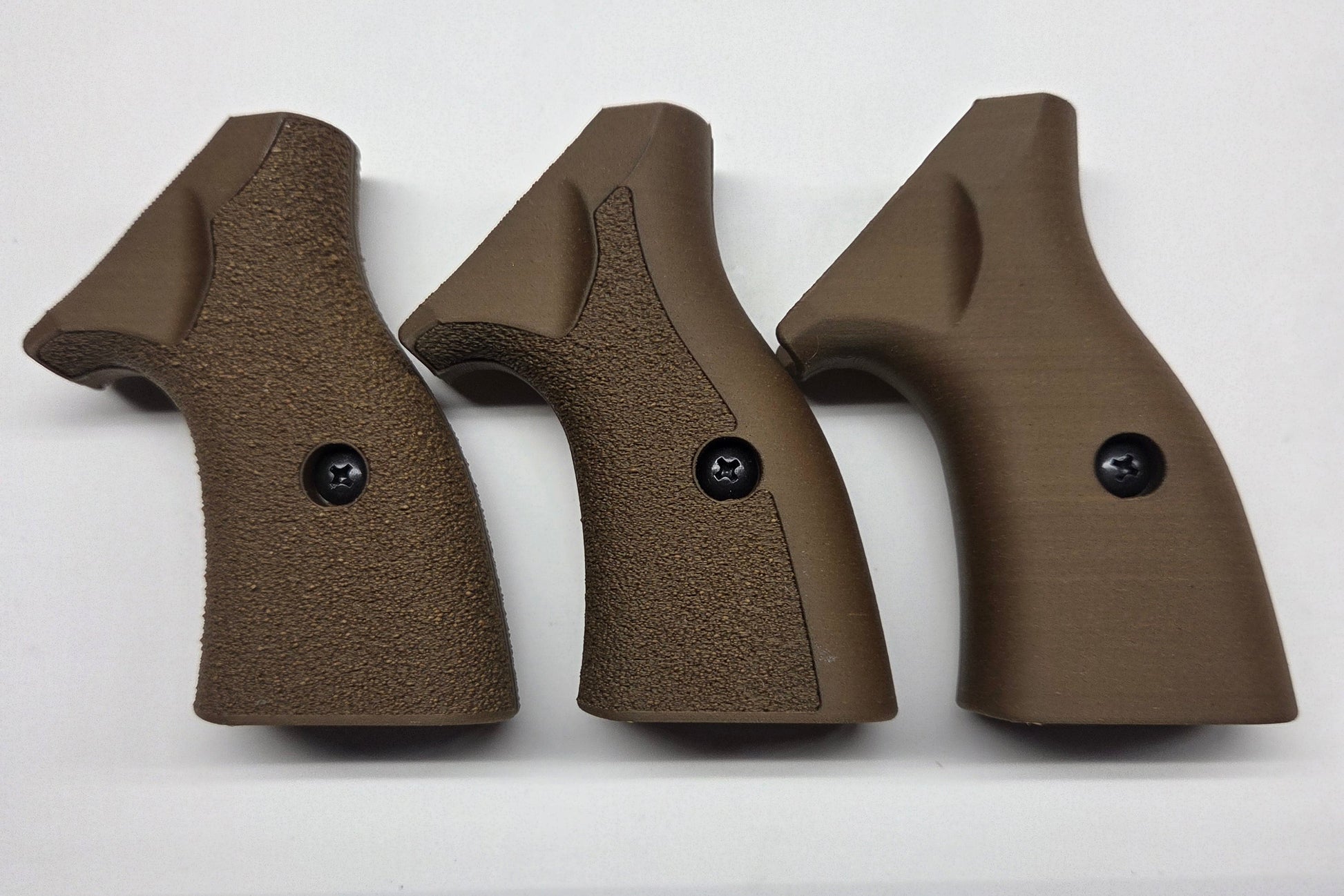 C² Polymer grips are 3D printed from durable PLA+ and have been extensively tested for several years. We offer a variety of attractive colors and three textures. Because of the printing process, the "Smooth" grips have layer lines that give a bit of purchase, but will not irritate skin or catch on clothing. The "Front Strap Stipple" texture give you a 60 grit sandpaper type texture where it counts on the front strap, but is still smooth on the back strap for carry comfort. The "Full Stipple" wraps that texture around the whole grip for maximum control.