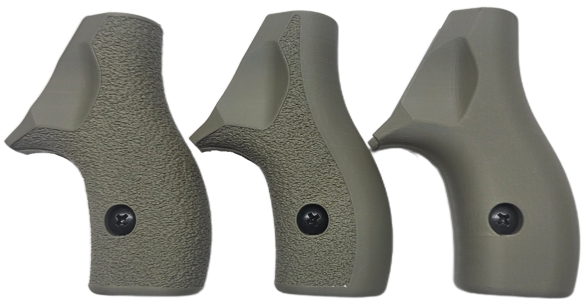C² Polymer grips are 3D printed from durable PLA+ and have been extensively tested for several years. We offer a variety of attractive colors and three textures. Because of the printing process, the "Smooth" grips have layer lines that give a bit of purchase, but will not irritate skin or catch on clothing. The "Front Strap Stipple" texture give you a 60 grit sandpaper type texture where it counts on the front strap, but is still smooth on the back strap for carry comfort. The "Full Stipple" wraps that texture around the whole grip for maximum control.